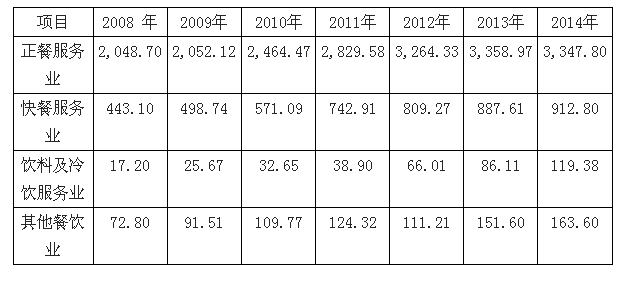 2008-2014 年中国规模以上餐饮业各类型服务主营业务收入(单位:亿元)